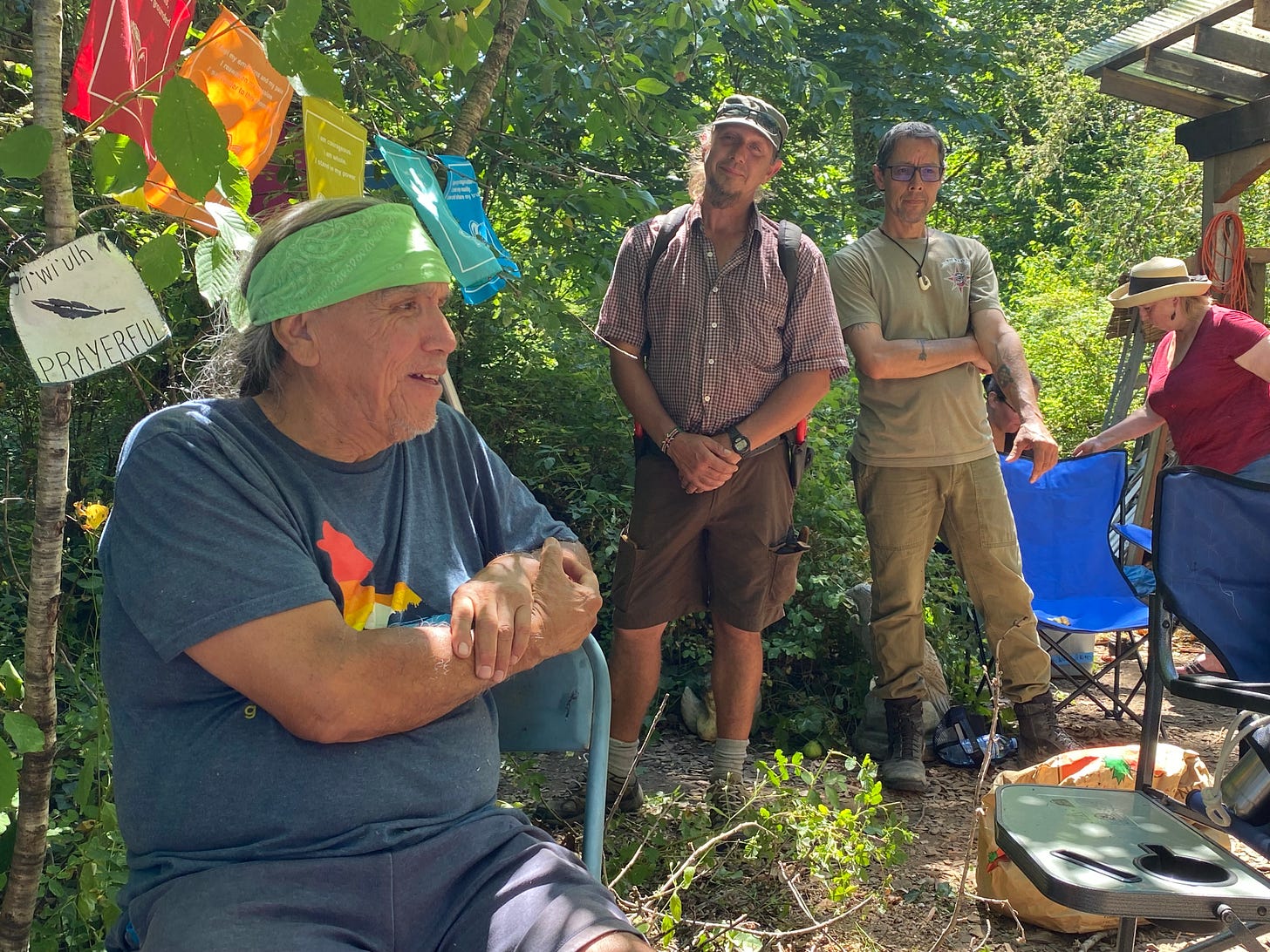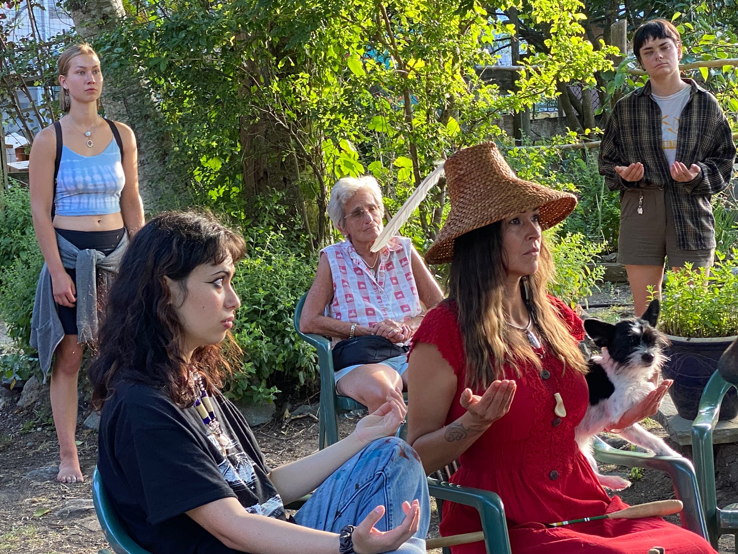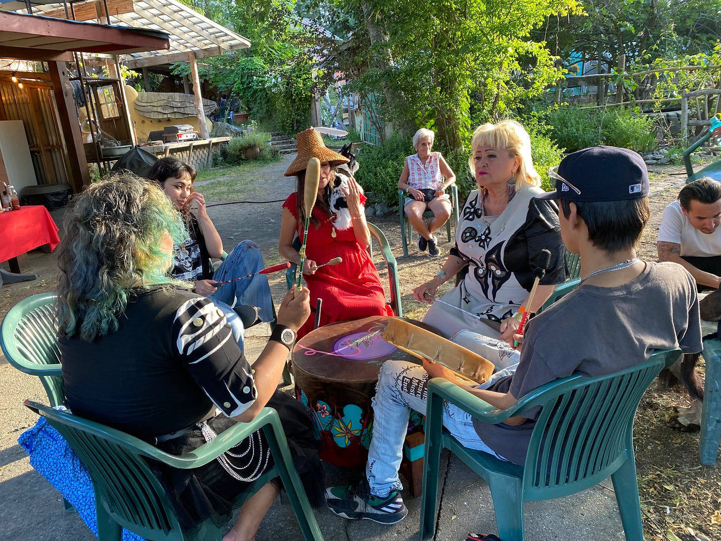 We were welcomed to the Ecovillage by Qwiyahwlt-hw, an elder of the Cowichan Nation whose land we were on, and his partner Pamela. Indigenous cultures have strict protocols, and Hiinahcit asked his permission, gifting him and Pamela with blankets, to bring her women’s drumming group to drum with us. From a social permaculture perspective, protocols are powerful tools for regulating relationships and forestalling any potential conflicts between neighboring groups. They are rooted in respect, and consent. You don’t enter someone’s territory without their consent and start doing your thing, any more than you’d walk into someone’s house uninvited and start playing their piano. Living on stolen land as we do, with all boundaries broken, it takes time to readjust and accept that real decolonization might mean we don’t just get to do what we want, where we want, as if all the resources of the world were ours to exploit.