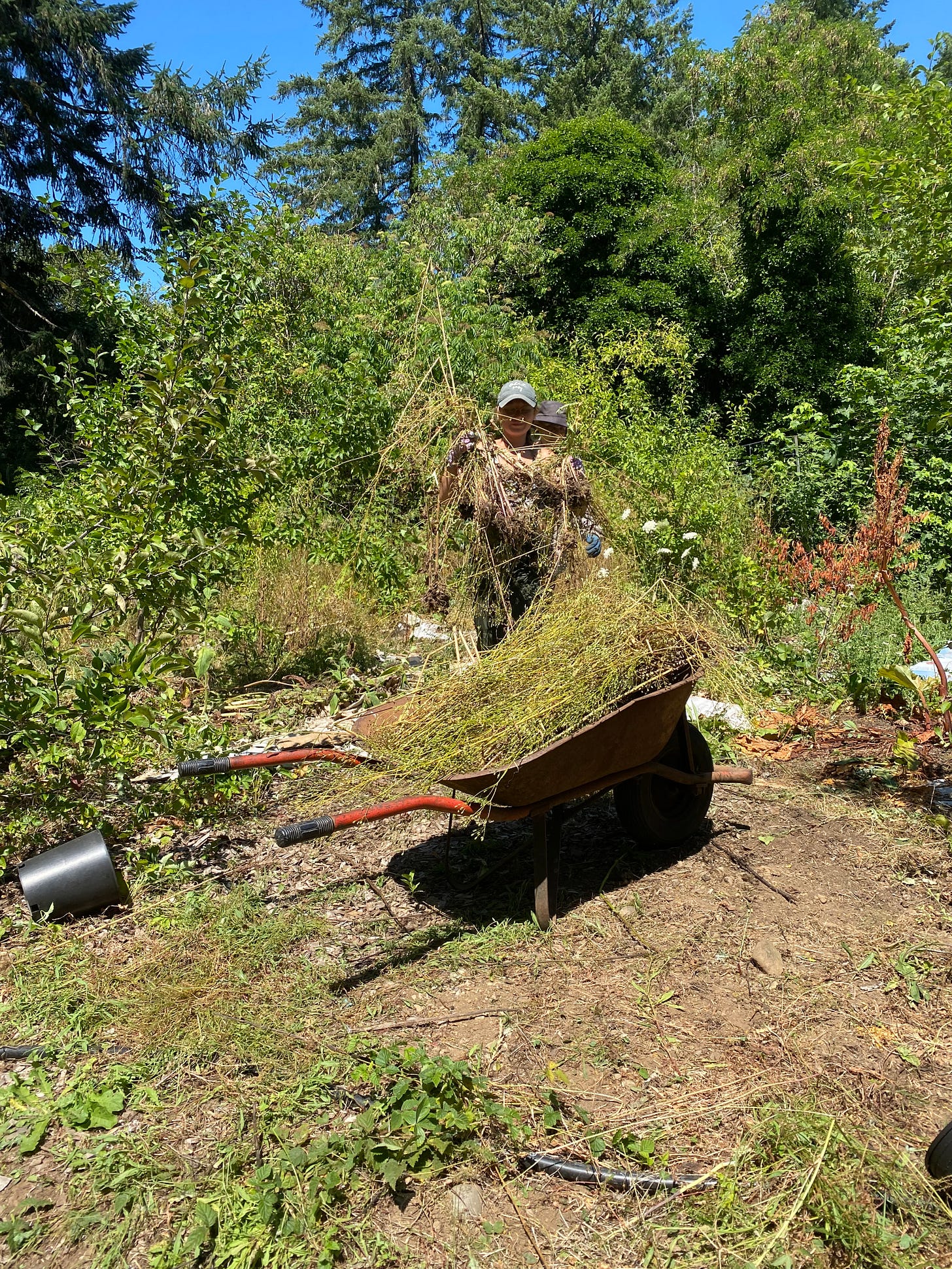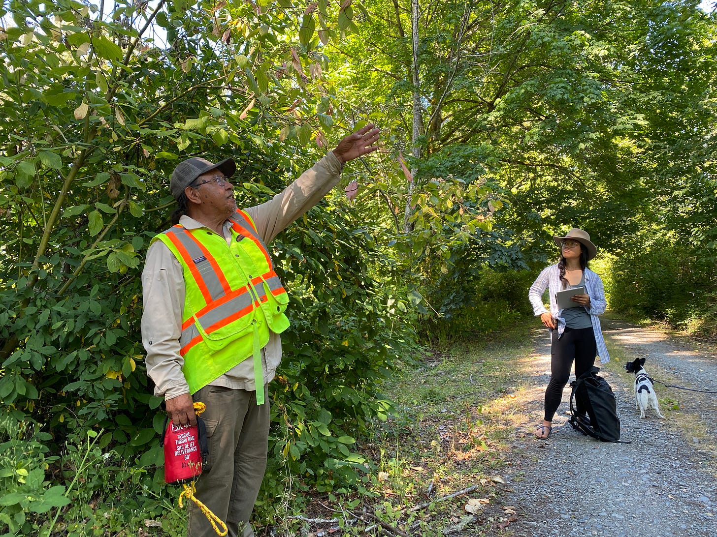 The next day, we went to Qwiyahwlt-hw’s land on the reserve. Over the last several years, our students have designed food forests for him and other elders, then mustered volunteers to help plant and tend them. It’s a pleasure to return each year and see what has grown, mourn for what failed to thrive, and put some energy into tending the land. Qwiyahwlt-hw has a sweat lodge overlooking the river, and this time he was asking for help tending an overgrown orchard that lay behind a choked path of ivy and blackberries.