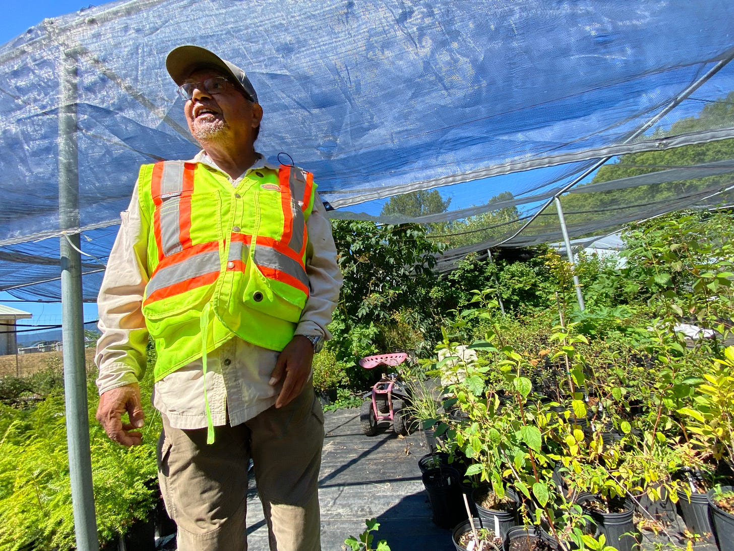 On our tour day, we visited the salmon hatchery and native plant nursery of Ken Elliot, a Cowichan elder who has devoted his life to restoring the fisheries and the rivers. Ken is a great storyteller, and he told a tale of a harrowing accident that nearly killed him, but instead opened him up to listen to the salmon and the voices of nature. The salmon told him that their children were dying, and he knew then that he had to restore their habitat and protect the streams and rivers where they spawn. So he began growing and planting the native plants that thrive in the riparian zones and are needed to provide shade, bank stability, food and shelter. He led us on a nature walk to the river, where half the class jumped in, fully clothed.