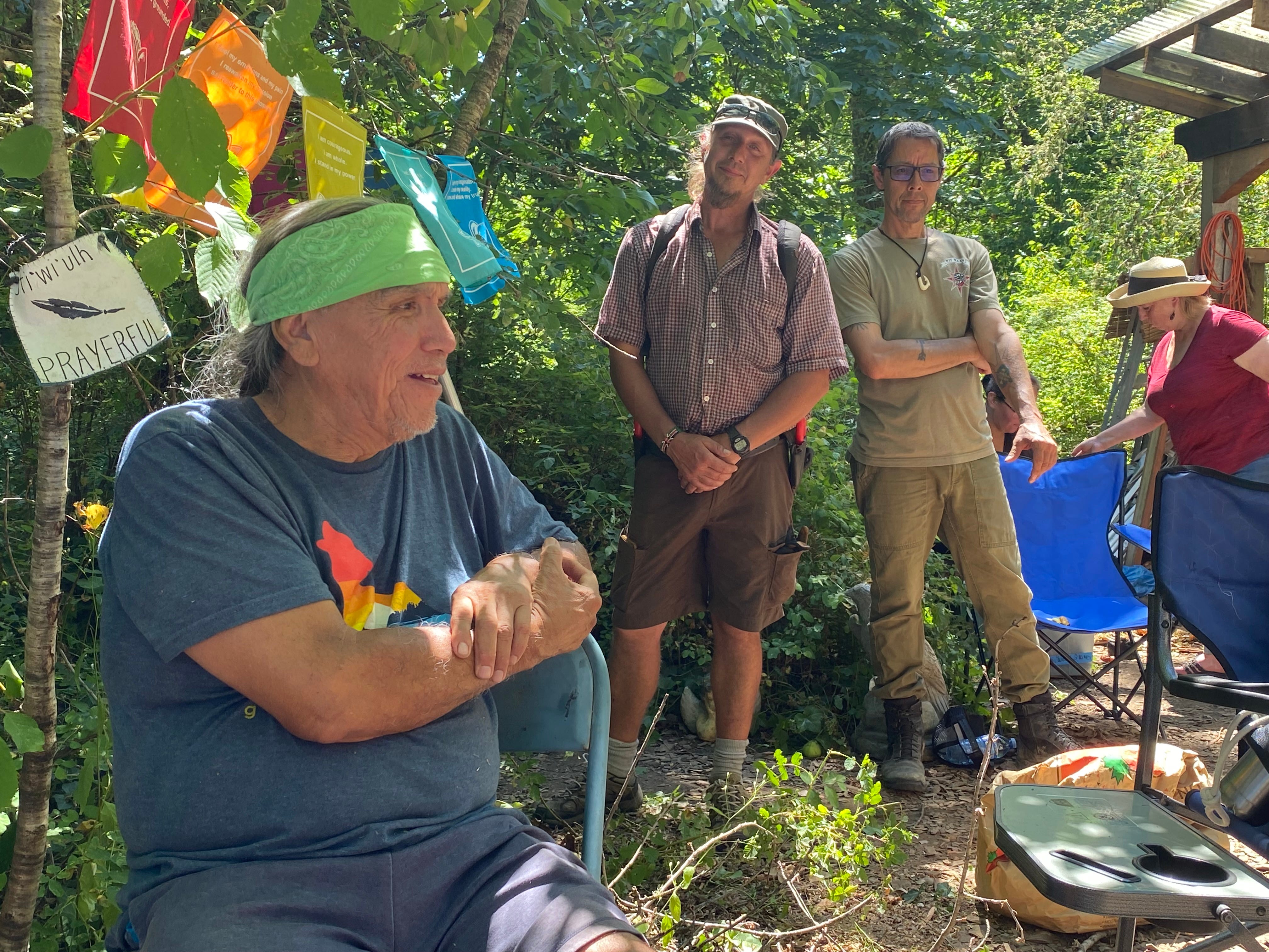 The next day, we went to Qwiyahwlt-hw’s land on the reserve. Over the last several years, our students have designed food forests for him and other elders, then mustered volunteers to help plant and tend them. It’s a pleasure to return each year and see what has grown, mourn for what failed to thrive, and put some energy into tending the land. Qwiyahwlt-hw has a sweat lodge overlooking the river, and this time he was asking for help tending an overgrown orchard that lay behind a choked path of ivy and blackberries.