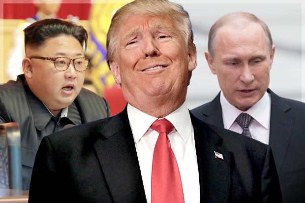 The camera light flickers on. A portrait of Andrew Jackson glowers in the background. Donald is perched behind the Resolute Desk, leaning toward a giant screen where Vladimir Putin appears.