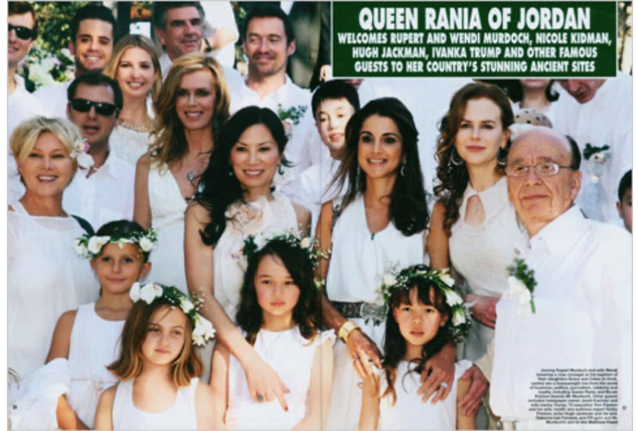I started my piece on Blair and Israel with this vignette from back in the day. The christening of Rupert Murdoch’s youngest daughters on the banks of the River Jordan, starring Jared Kushner, the Queen of Jordan, a couple of Hollywood celebs…and lurking just out of shot, Tony Blair.