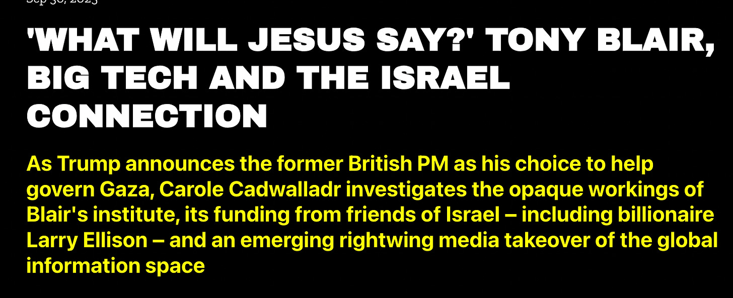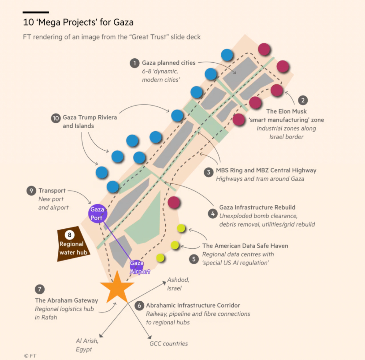This was already a timely piece because of Blair’s reported involvement in ‘redevelopment’ plans for Gaza as reported earlier this year in the FT including this extraordinary graphic. (The “Elon Musk smart manufacturing zone” alongside the “Gaza Trump Riviera”)