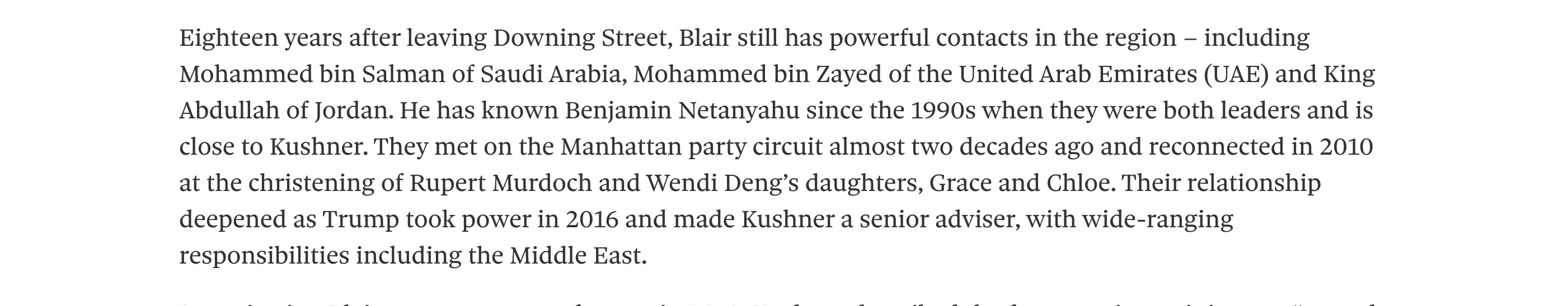 We were already on an incredibly tight deadline. And then the night before publication, came the announcement that Blair would be part of Donald Trump’s new ‘Peace Board’. It meant the piece couldn’t be more timely…but also that it needed re-nosing, re-editing, re-legalling…