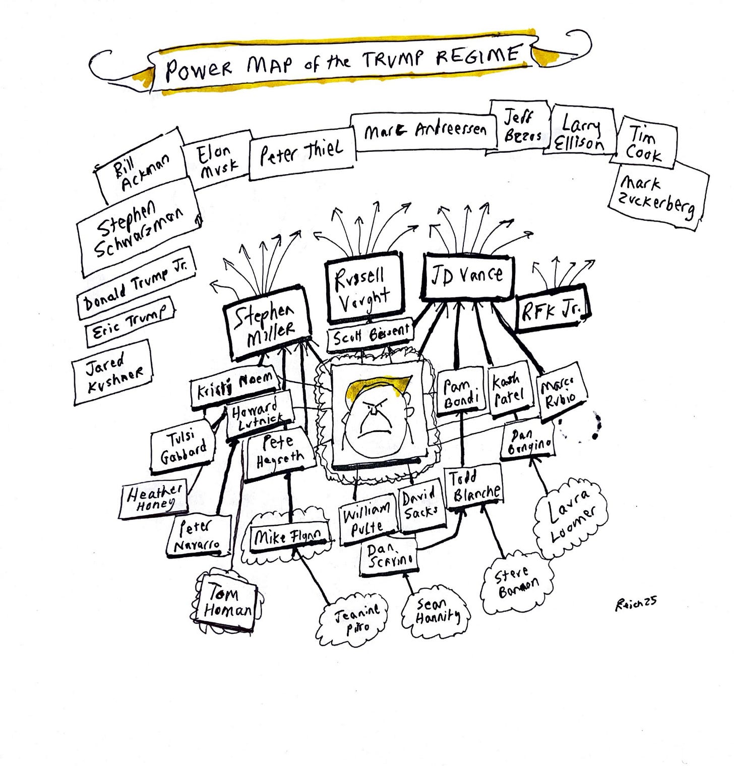 At the top of the power map you’ll see billionaire oligarchs who have extraordinary clout in the Trump regime. In effect, the regime reports to them.