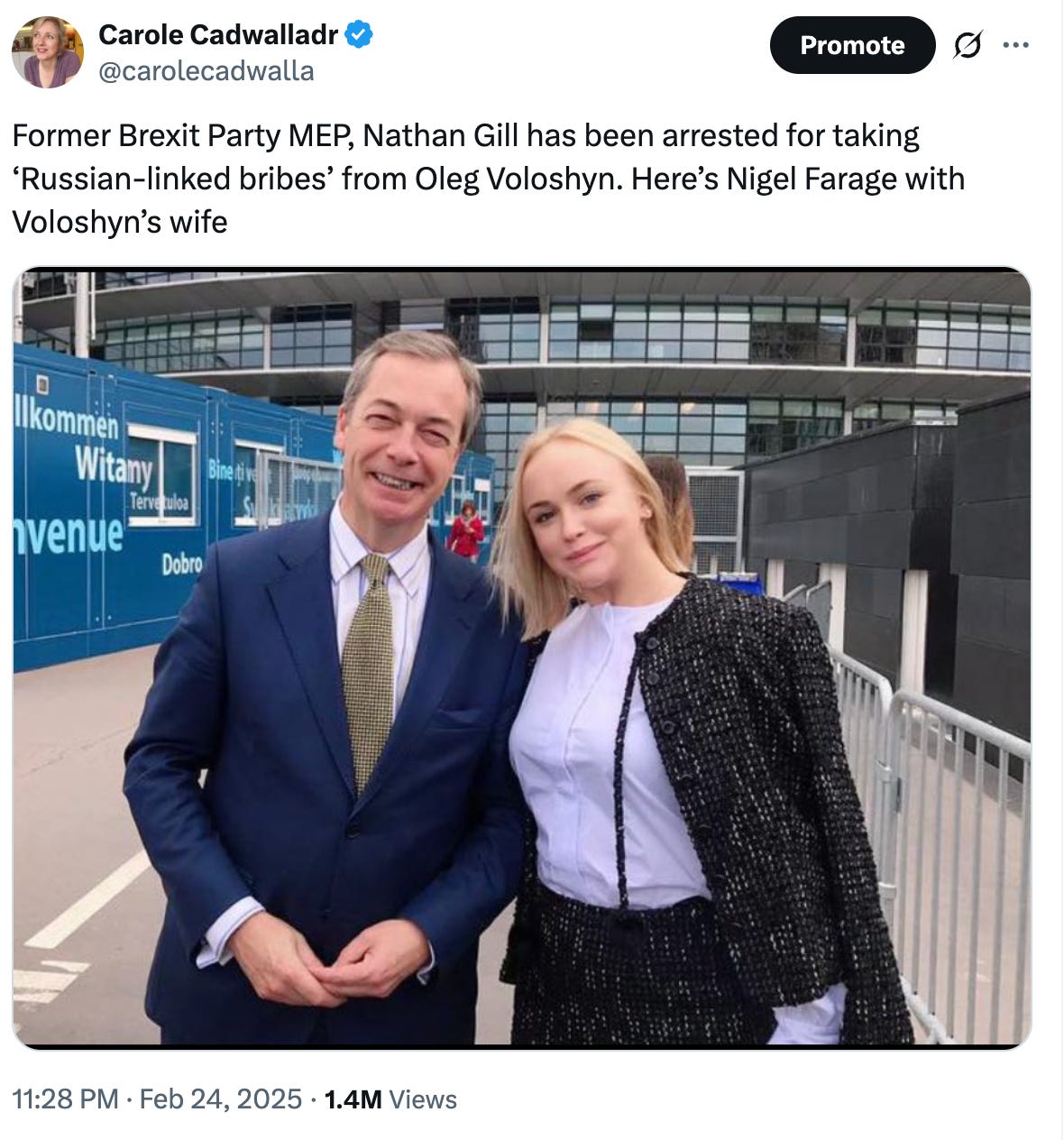 Nathan Gill’s co-defendant and the one who gave him the bribes was a Ukrainian politician who the US authorities describe as an “FSB pawn”. Here’s his wife with Nigel Farage: