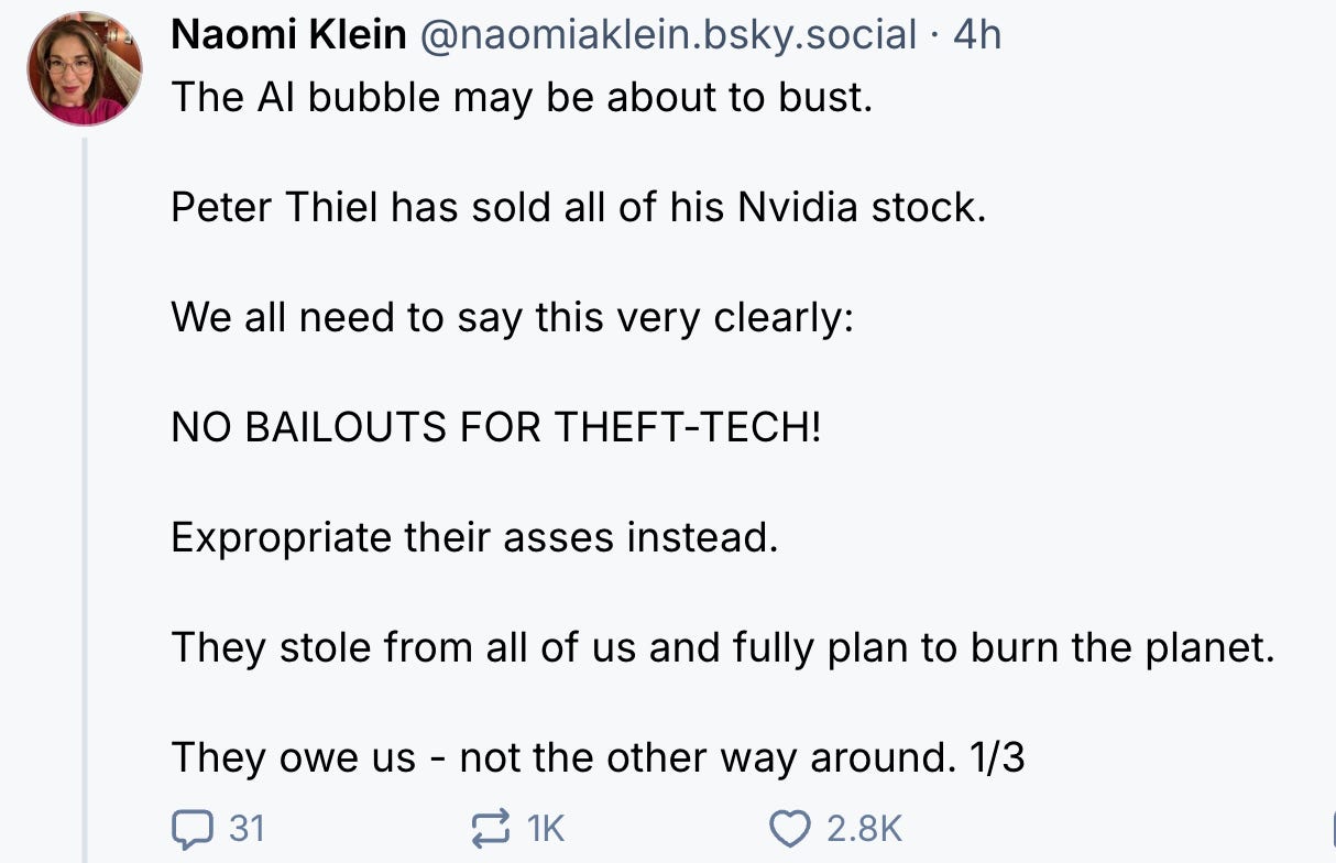 It’s not a coincidence that the first person I’ve seen post on this outside a small circle of tech sceptics and tech investors and a few business reporters is the writer, Naomi Klein.