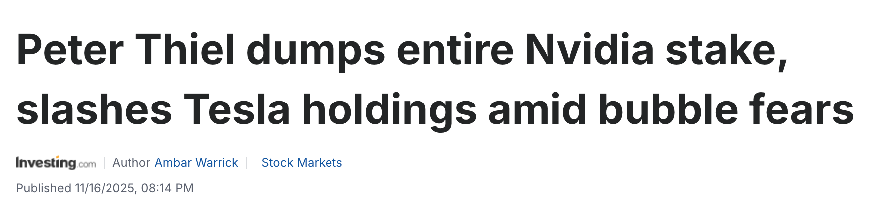 And today, in a strange bit of timing, news lands that Peter Thiel – the closest thing the modern world has to a real-life Bond villain – has dumped his entire holding in Nvidia, the chip manufacturer. That’s the company which, alongside OpenAI, sits at the very centre of a trillion dollar…gamble. Or, as some people are calling it, a bubble. A bubble that could upend the entire US economy.