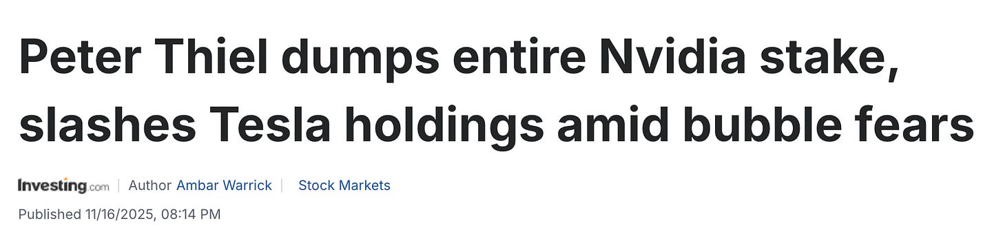One spicy fact I left out of my piece yesterday was that Michael Burry, the legendary investor at the centre of Michael Lewis’s book on the financial crisis, The Big Short, shocked the market last week. He also decided AI’s a bubble and he took action: shortselling not just Nvidia but also Palantir.