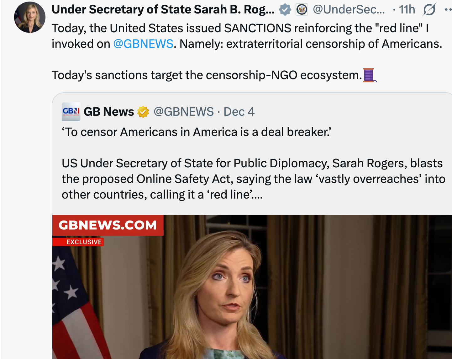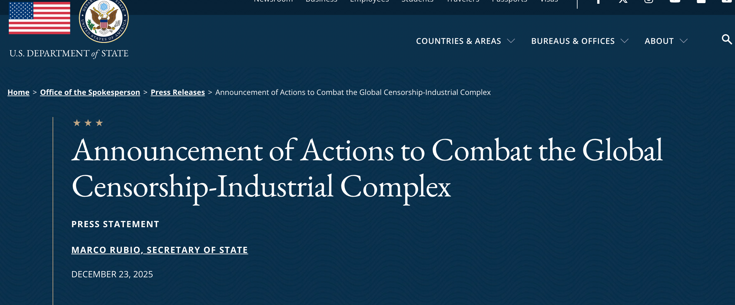 But fascism never sleeps. And last night – after European offices had closed for the holidays – the US state department announced “Actions to Combat the Global Censorship-Industrial Complex” and that it would be barring five individuals from the United States.