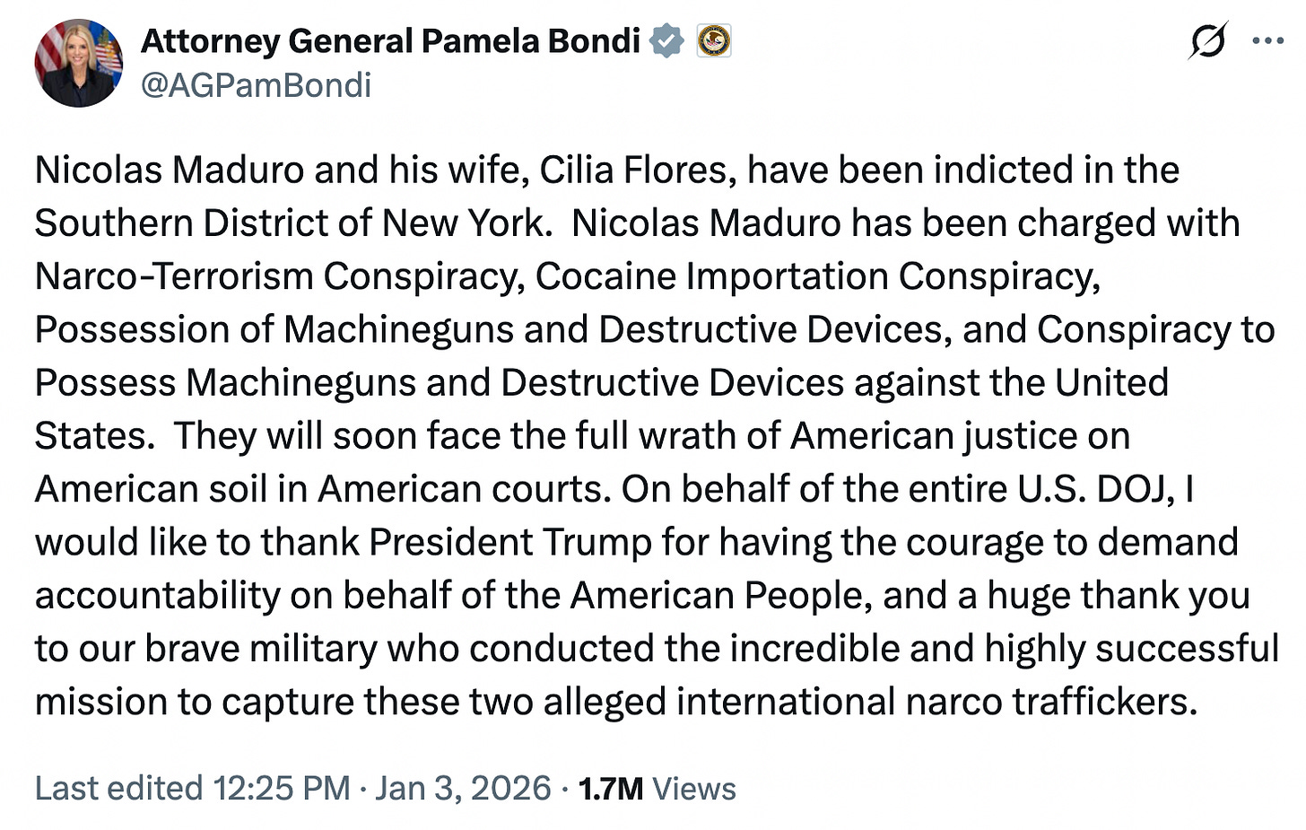 Update: after writing that paragraph, AG Pam Bondi released a criminal indictment for Nicolas Maduro on “Narco-Terrorism Conspiracy” and other Byzantine charges. He will “soon face the full wrath of American justice”, another not-exactly-legal term.