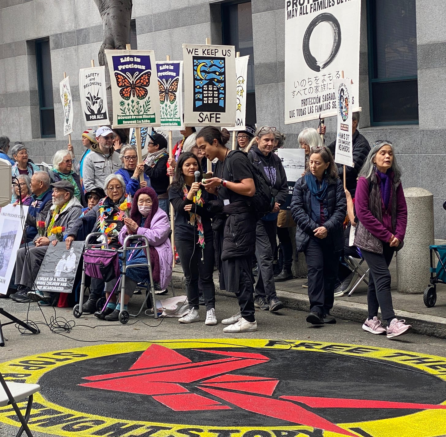 We took over the street outside the ICE building, painted a mural on the street, and for three hours held a vigil that included song, prayer, dance and testimonies from immigrants and from survivors of the World War II internment camps. It was a small but spirited demonstration, very peaceful and prayerful. Groups of artists, coordinated by David Solnit, an arts activist who has been instrumental in uplifting the visual impact of the Resistance for forty years or more, created beautiful signs and banners. I joined with Rising Up to Action, a local group I’ve done trainings for, and the 1000 Grandmothers for Future Generations.