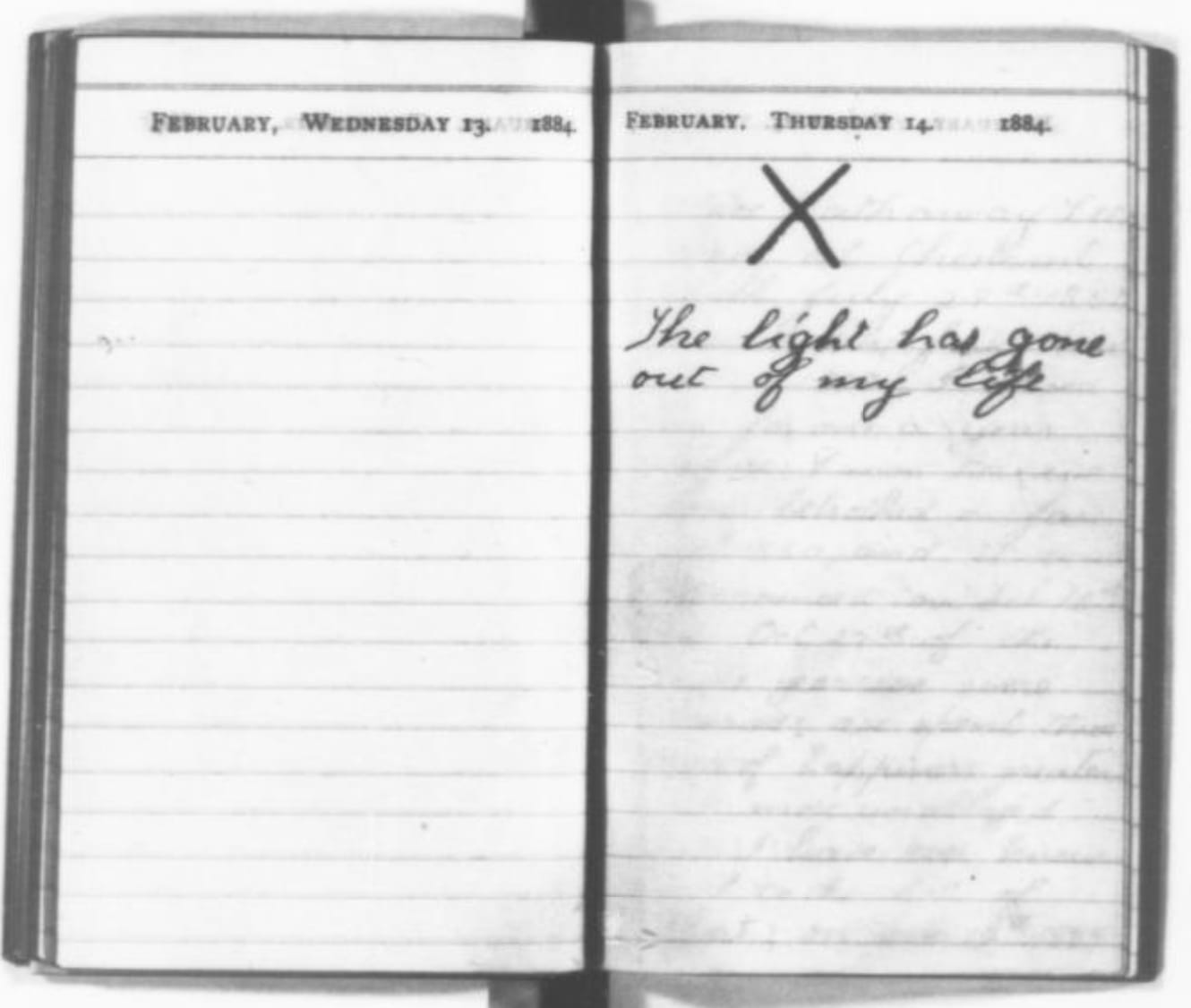 On February 14, 1884, Roosevelt slashed a heavy black X in his diary and wrote “The light has gone out of my life.” He refused ever to mention Alice again.